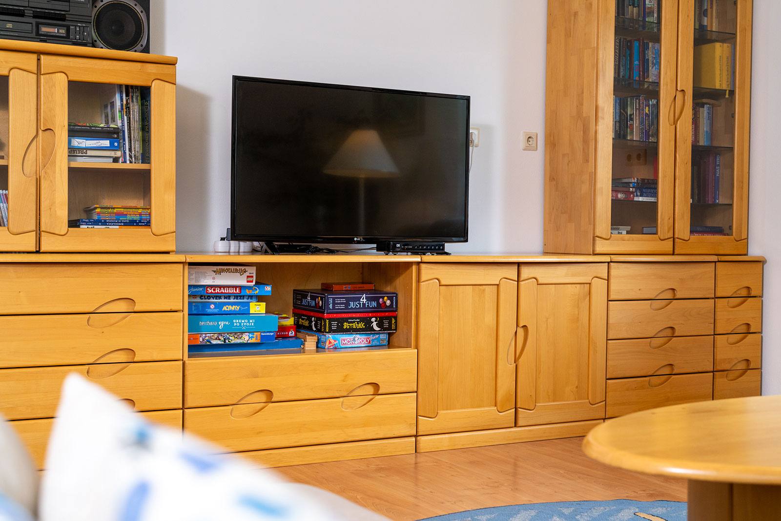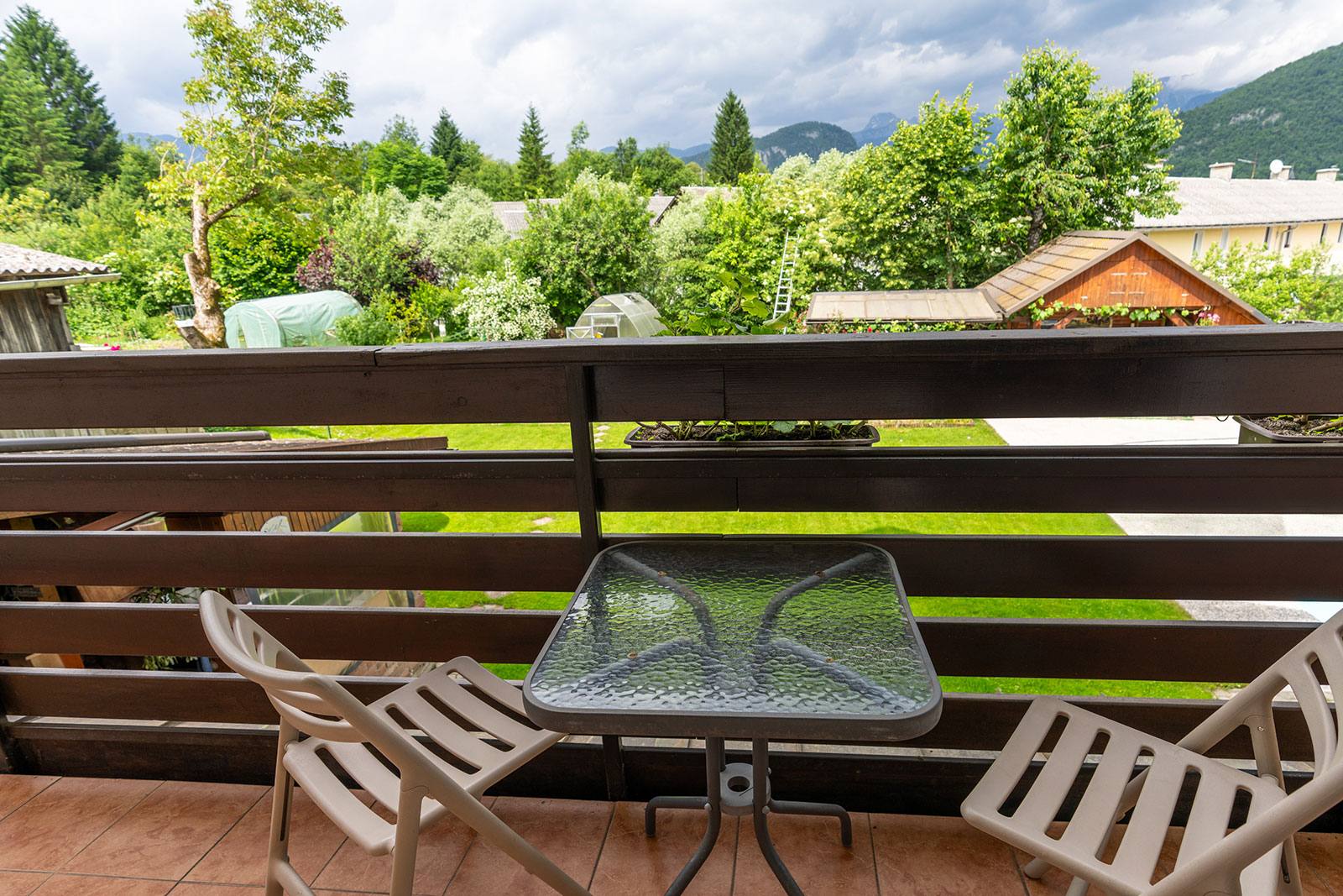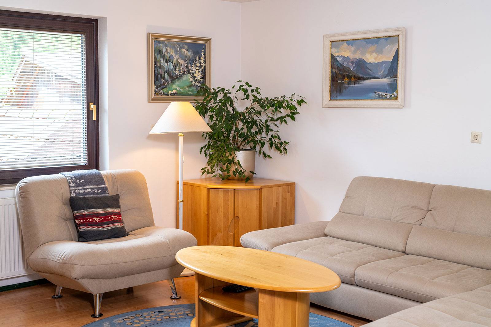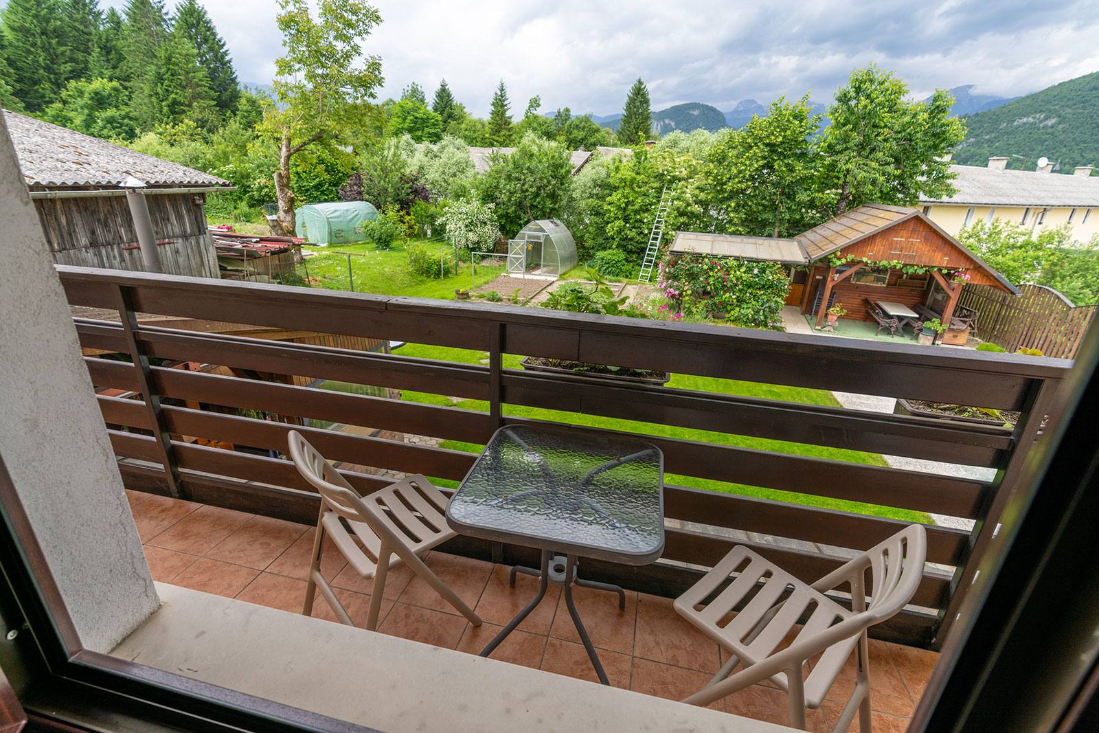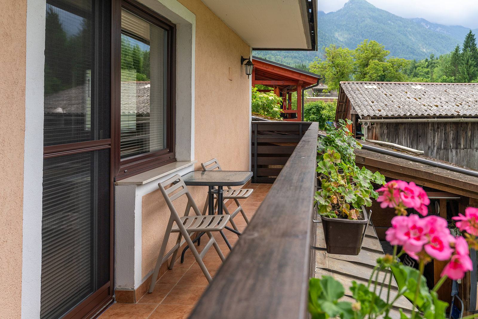 Naš največji apartma z ročno izdelanim masivnim pohištvom se nahaja v pritličju hiše in meri 86,5 m². Ima spalnico z zakonsko posteljo, otroško sobo z dvema enojnima posteljama, dnevno sobo z dvojnim kavčem in TV-sprejemnikom, veliko kuhinjo z jedilnico, stranišče in kopalnico s tušem. Z veliko sedalne površine in knjižnimi omarami je pisan na dušo vsem ljubiteljem branja. Iz vseh dnevnih prostorov in z zasebnega balkona se razprostira pogled na Bohinjsko dolino in Triglav. Velika kuhinja je opremljena s pomivalnim strojem, pečico, velikim hladilnikom in zamrzovalnimi predali ter osnovnimi potrebščinami za pripravo hrane.