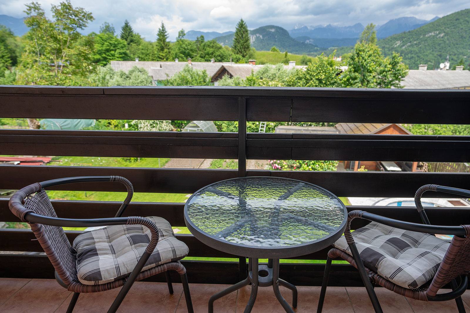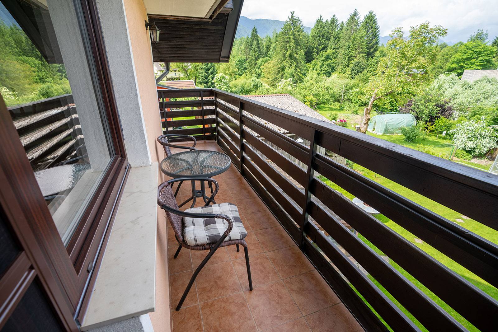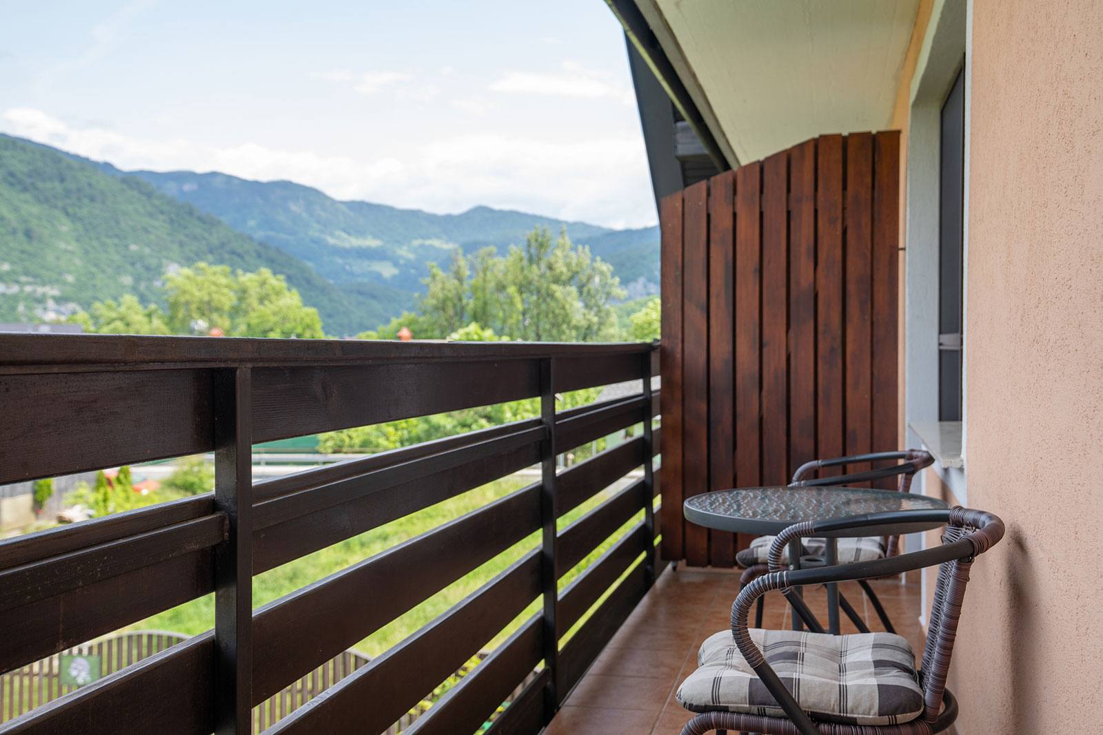 - Studio za 2 osebi v velikosti 22,1 m² s kuhinjsko nišo z električnim štedilnikom in hladilnikom, zakonsko posteljo, TV-sprejemnikom, brezžičnim internetom ter kopalnico s tušem gostu omogoča udobno namestitev. Na balkonu lahko uživate v sončnem zahodu, ko se sonce spušča za Komno, in občudujete Julijske Alpe s Triglavom na čelu. Spalni del je opremljen z ročno izdelanim masivnim pohištvom iz lokalnega podjetja Pohištvo LIPP.